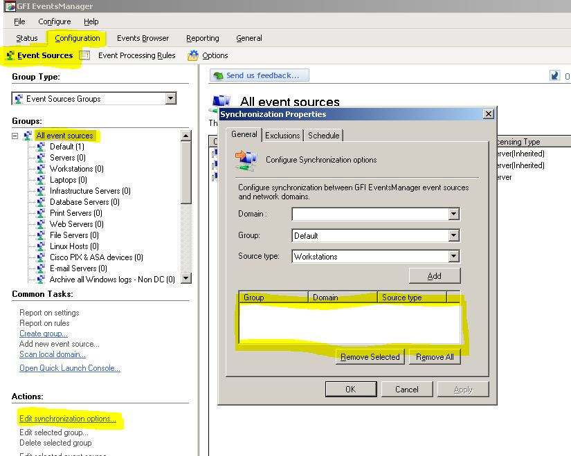 GFI EventsManager enables you to synchronize domains with event sources groups. When the synchronization is configured, the domain members will be added automatically to GFI EventsManager Event Sources.