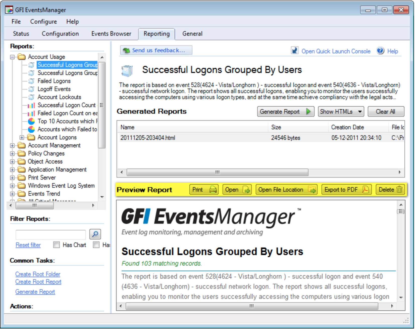 | Open | Use the Open button to open the selected report in a browser. GFI EventsManager uses your default browser to view reports in HTML. |
